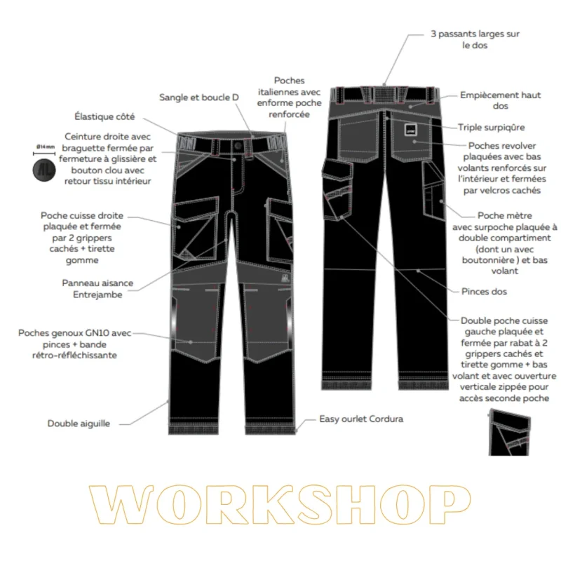 Elastique côté | Sangle et boucle D | Ceinture droite avec braguette fermée par fermeture à glissière et bouton clou avec retour tissu intérieur | Poche cuisse droite plaquée et fermée par 2 grippers cachés + tirette gomme | Panneau aisance entrejambe | Poches genoux GN9 avec pinces + bandes rétro-réfléchissante | Double aiguille | Poches italiennes avec enforme poche renforcée | 3 passants larges sur le dos | Empiècement haut dos | Triple surpiqûre | Poches revolver plaquées avec bas volants renforcés sur l'intérieur et fermées par velcros cachés | Poche mètre avec surpoche plaquée à double compartiment (dont un avec boutonnière) et bas volant | Pinces dos | Double poche cuisse gauche plaquée et fermée par rabat à 2 grippers cachés et tirette gomme + bas volant et avec ouverture verticale zippée pour accès seconde poche | Easy ourlet Cordura