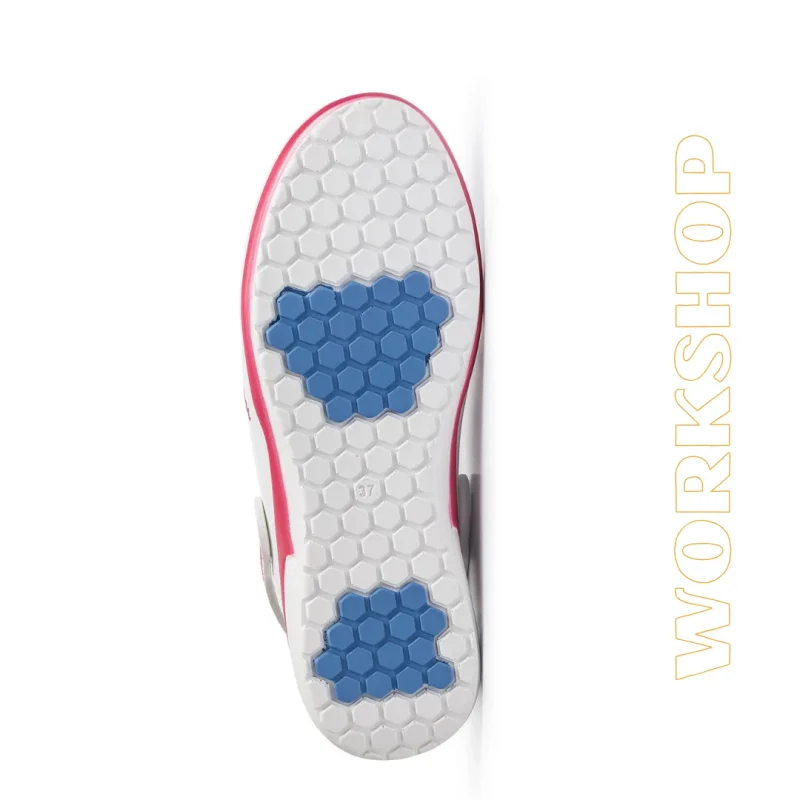 Semelle en polyuréthane avec talon compensée, empreinte en forme d’alvéoles antidérapante de double densité, bi-composant à base de polyuréthane et de TPU combinés pour augmenter le coefficient d’efficacité antidérapante du sabot.