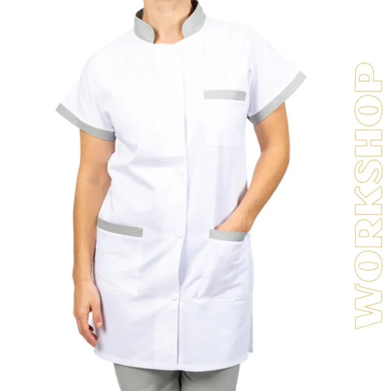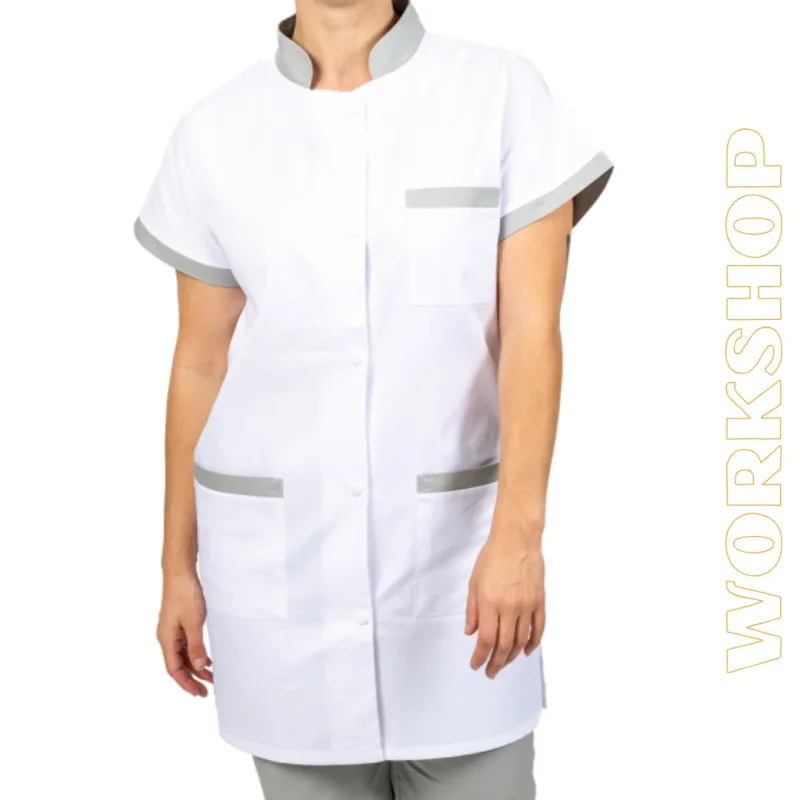 CARACTERISTIQUES : Col mao contrasté, manches courtes kimono + parement contrasté, 2 poches basses + parement contrasté, 1 poche poitrine +parement contrasté, 1 fente sur les cotés, fermeture par 5 pressions calottées, hauteur milieu dos 85 cm