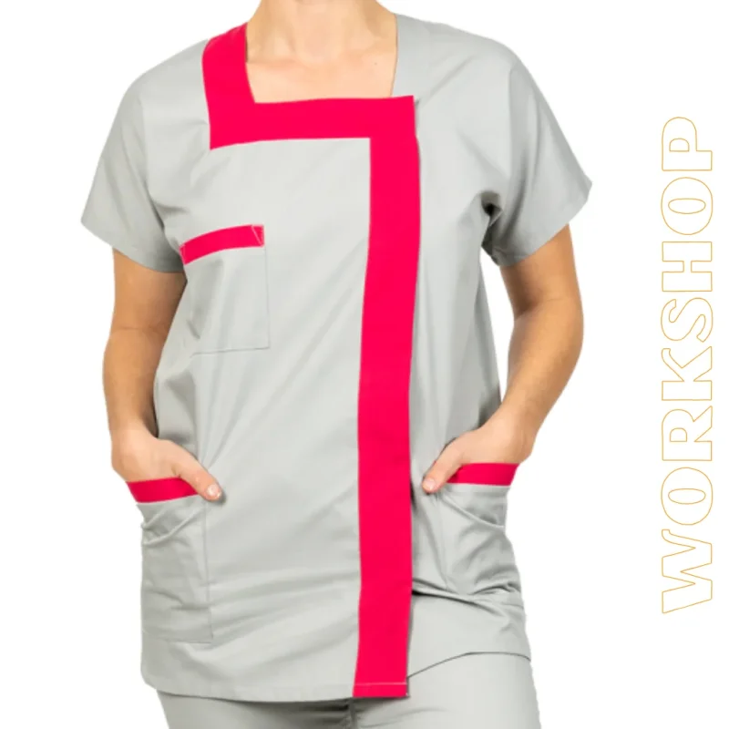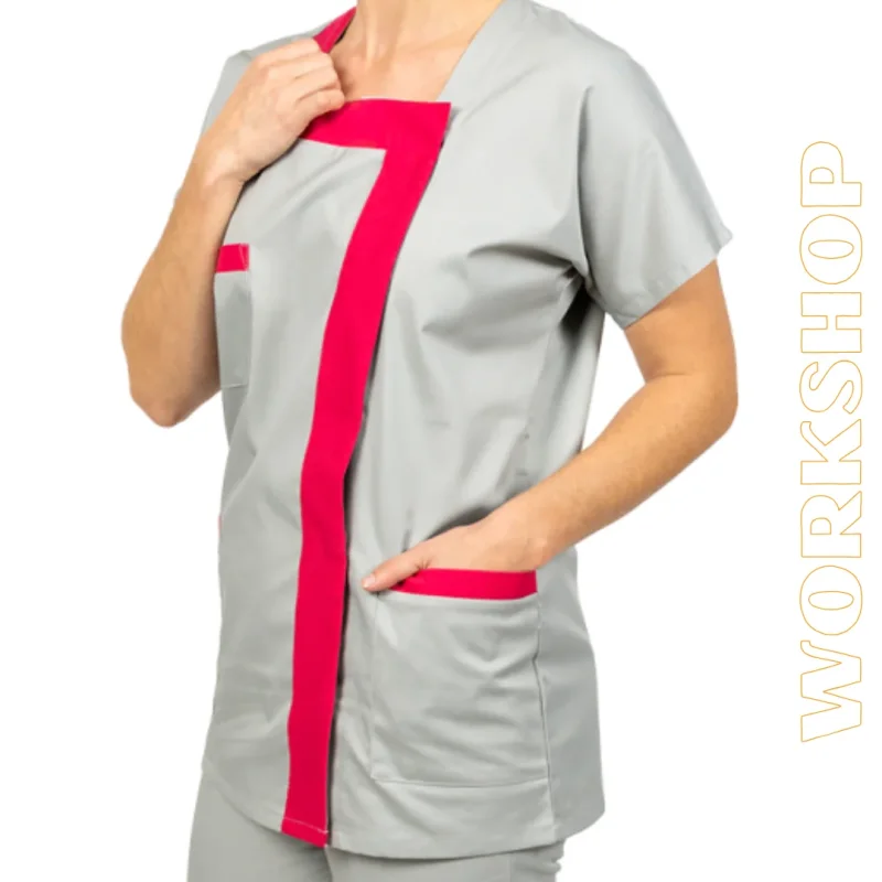 CARACTERISTIQUES : Col carré, manches courtes kimono, 2 poches basses plaquées + parement contrasté, 1 poche poitrine + parement contrasté, fermeture par 5 pressions inox cachées, hauteur milieu dos 75 cm